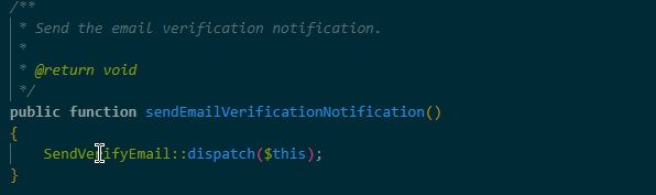 Update the "MustVerifyEmail" file to dispatch the job instead of sending the email (vendor\laravel\framework\src\Illuminate\Auth\