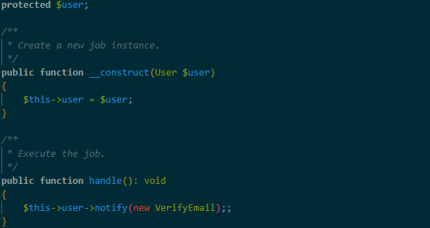 Navigate into the "SendVerifyEmail" file (App\Jobs\SendVerifyEmail.php) and update it as follows.
